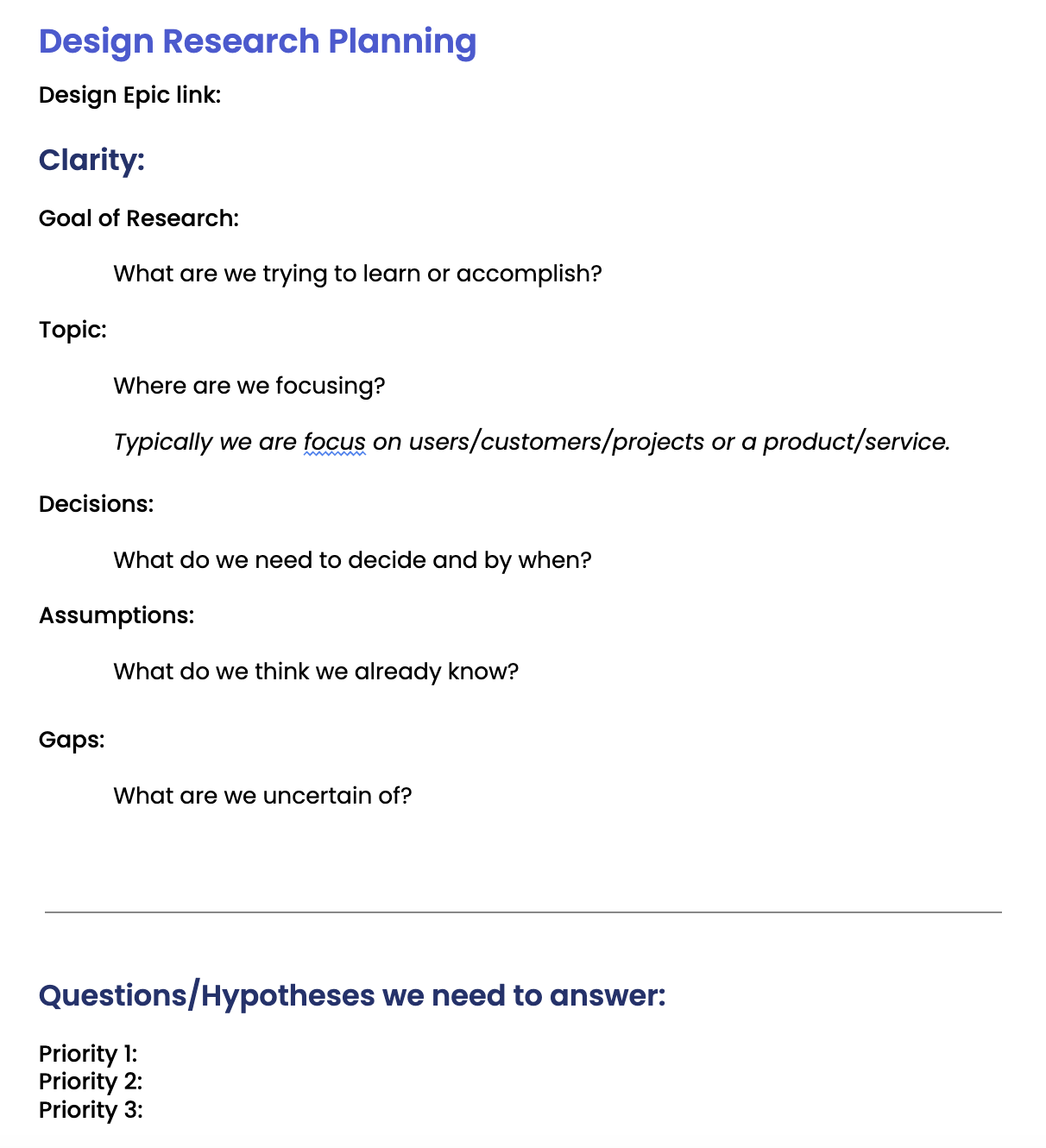 To ensure our team could easily scale their research efforts using the new process document, I developed a comprehensive set of templates and standards designed to simplify every step. I created: