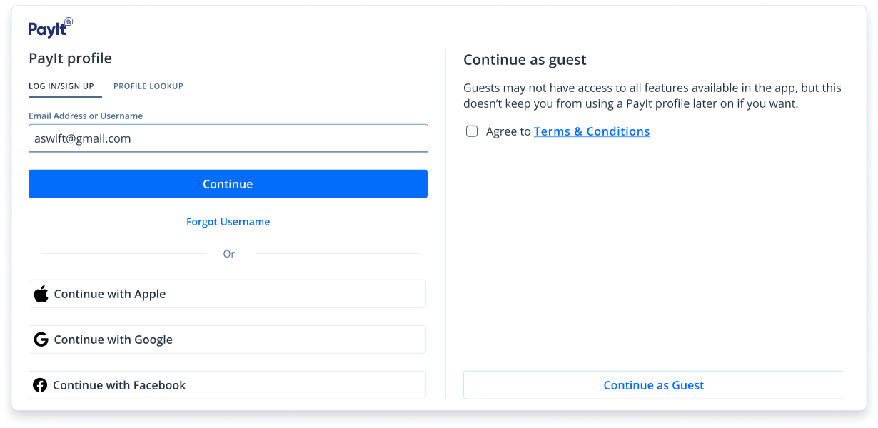 We initially explored several modal-based login versions designed to seamlessly overlay any PayIt application. However, after careful consideration, we landed on implementing an OAuth-based login that could be configured as it’s own standalone application and integrated with any PayIt-supported app now or down the road.