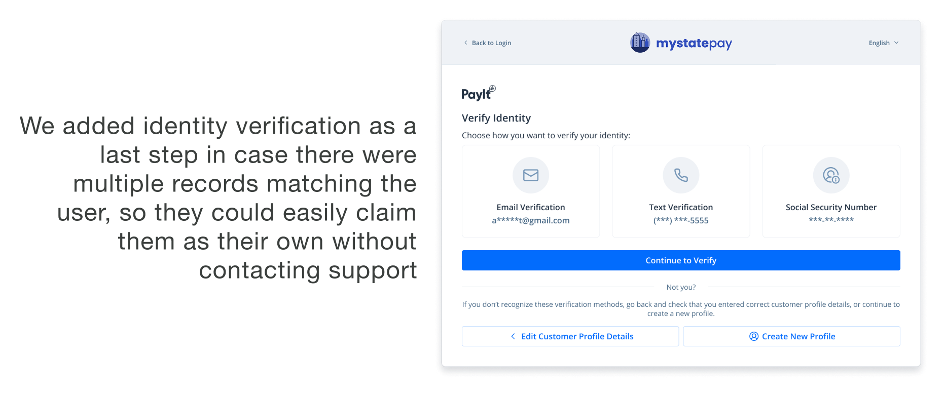 In the legacy system, users had to enter some personal information to find their historical records and tie them to their account. We had to maintain this system in the new PayIt Login but managed to increase the success of that process by 42%.